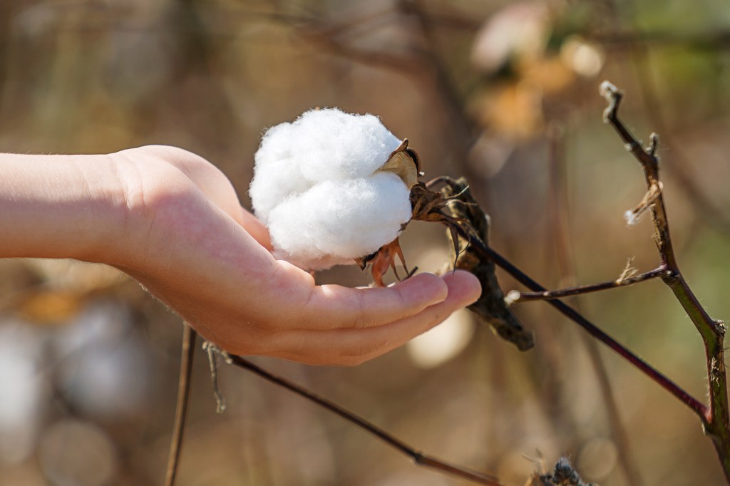 This is cotton. It can be turned into cloth. We get linen from flax plants. Check your tags. Do you see cotton or linen?