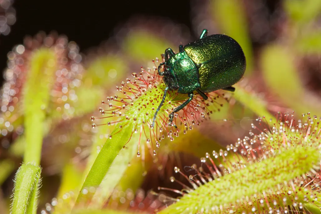 A sundew has sticky droplets on it. Insects are attracted to the droplets. They get stuck in them.