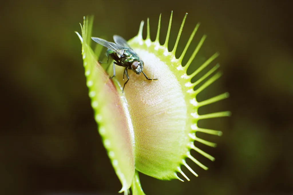 A Venus flytrap has leaves that open and close. There are spiky hairs inside them. The leaves snap shut when touched. Bye-bye, fly!