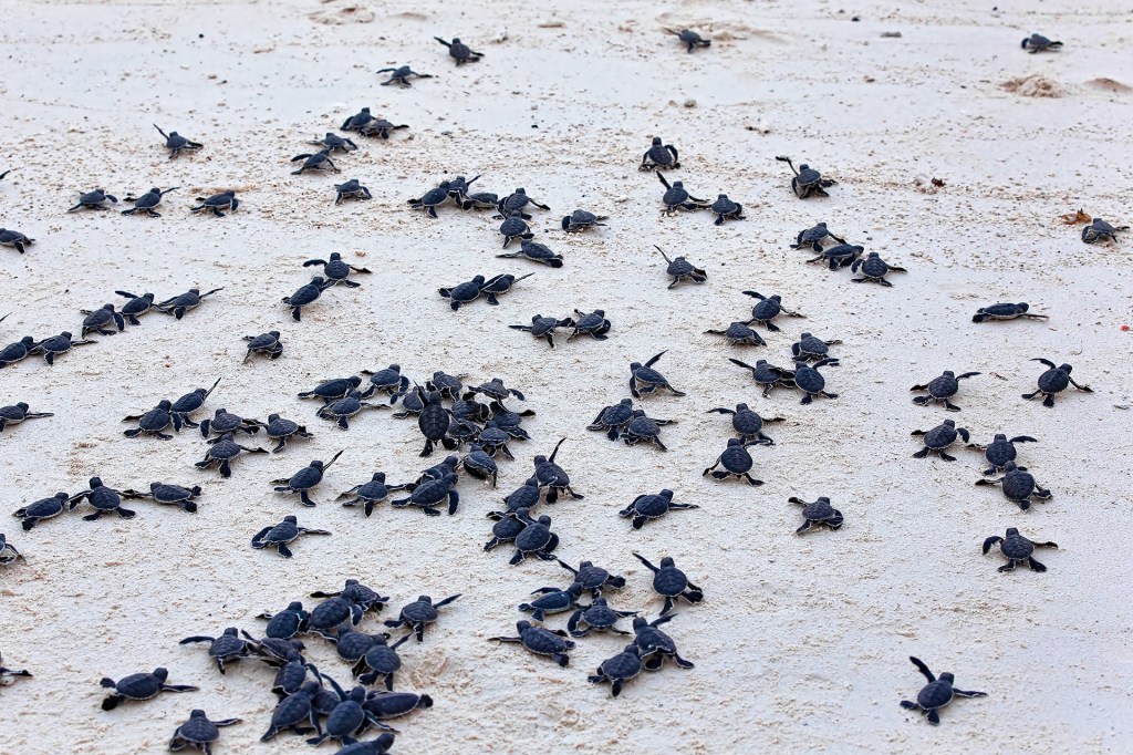 Sea turtles live in the water. But they lay eggs on land. Baby turtles hurry to the ocean when they hatch.