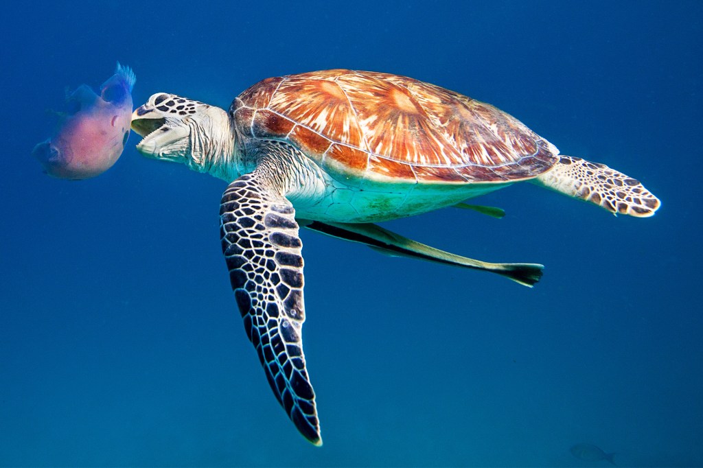 This sea turtle is chasing a jellyfish. Some sea turtles also eat plants. They eat seaweed and algae.